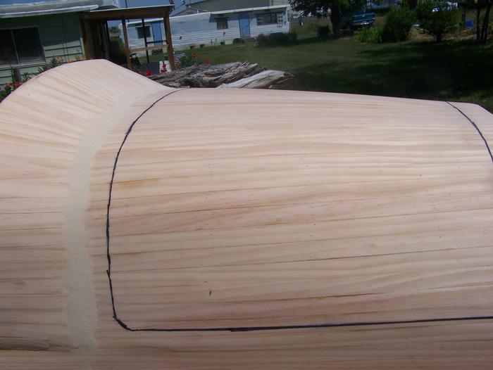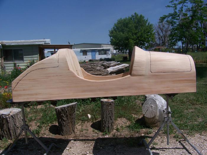 A little over a week since posting the pic of the body frame. Now have the entire body sheathed in clear pine, wood strips. Glue and staples hold the pieces together until glue sets. Then pull the staples (1170 in my case) and start sanding. Did not care for the seam between the dash riser and the hood, so some added wood putty. That came out well enough that am now building up a filet behind seat back and top of trunk. Once that is completed I'll be ready to order the epoxy, hardener, and fiberglass cloth. The black lines indicate where the body will be cut once glassed for the lift out hood, and hinged trunk. The body is wider than many build, but still within limits and I can get in and out without assistance. You know how it is with us old, fat, guys, right?