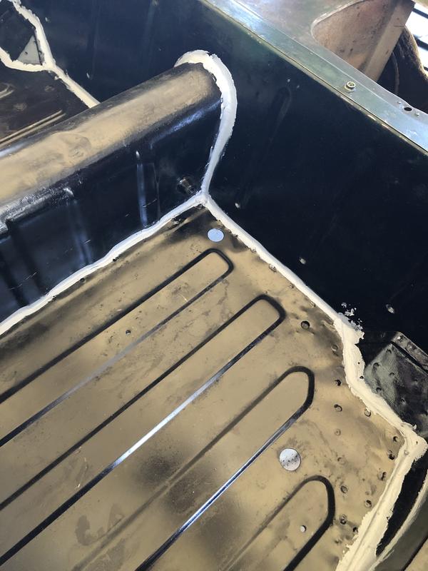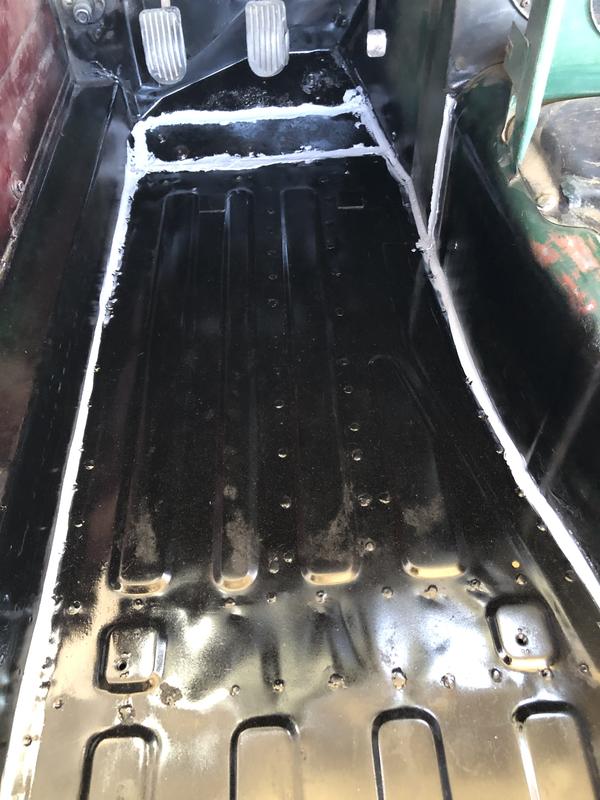 The drivers floorboard was replaced by a local British Specialty Shop, but they did not deliver the complete job my son had paid for. They had left unpainted bare metal after floorboard installation and had never put any kind of seam sealer. So after cleaning both sides and priming with Rustoleum, I applied seam sealer. After this dries I will paint the floorboards again and then we're on to carpet.