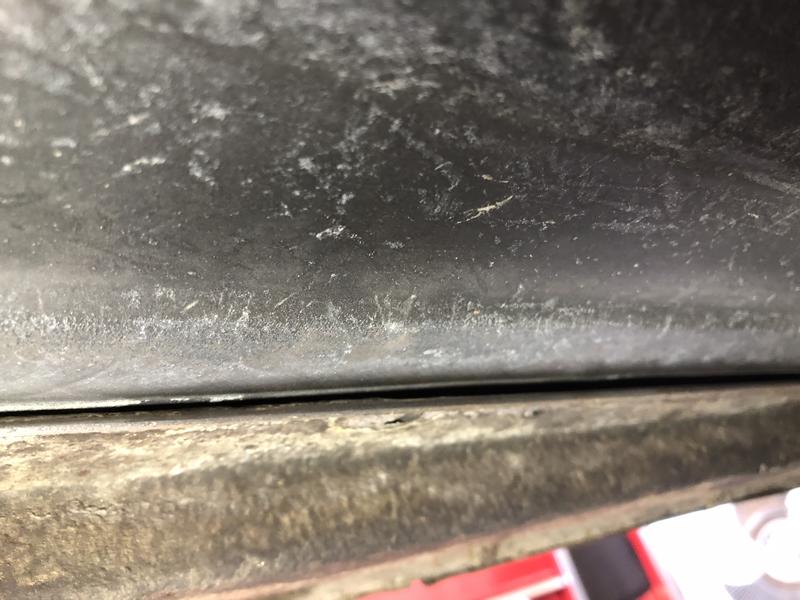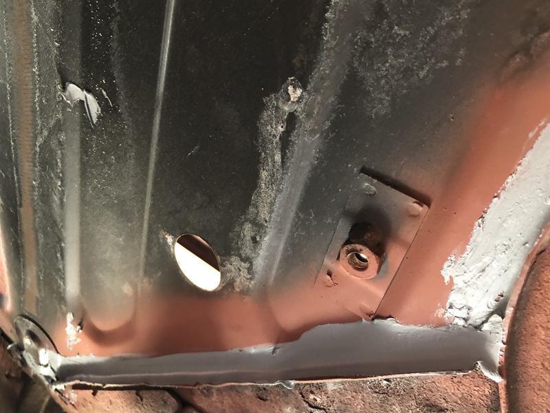 So today I took the wire wheel to the bottom side of the floorpan to clean of the surface rust, Afterwards I coated it with some primer. After that dried I put the seam sealer on. After that dried - I sprayed a topcoat on it.