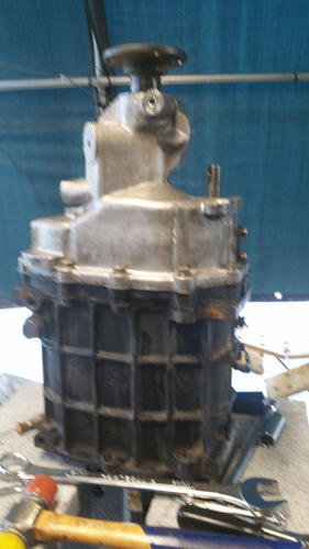 In the photo, please notice my elaborate transmission stand; $3 worth of large cinder blocks. What the heck - It worked.