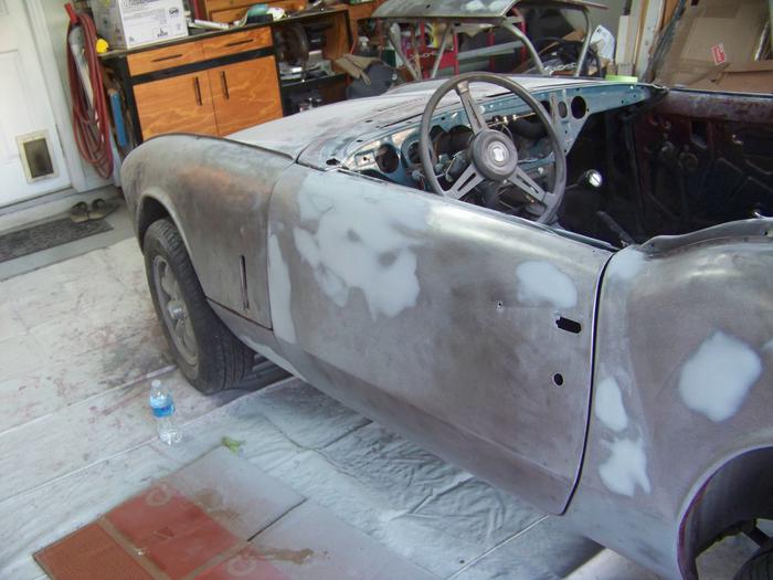 Its explained that it is like spray body filler. We are going to put a bunch of it on, and take a bunch of it off. Using the 80 grit sand paper, and the paint sticks we just used on the body filler. So, its kinda the same as what we just spent a month doing...."No", Jerry says, but it sounds like it to me...All along Jerry has been telling me we will use 3 coats - sanding the first one with 80 grit, the second with 180, and the final with 400 wet. I got all that. Now he is talking about hitting the car 3 times right now. With no sanding in between. As lost as a Second Lieutenant with a map and compass, I point out this glaring discrepancy in the plan. Turns out I wasn't paying proper attention - my idea of a "coat" and a painters are not the same thing! We are going to cover the car 3 times for EACH coat. That's 9 times, for those of you as dim as me. But, if my body work doesn't suck too bad, we may only go around twice on the last coat. Have to wait and see...