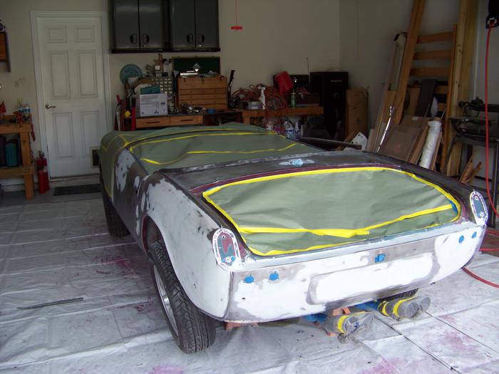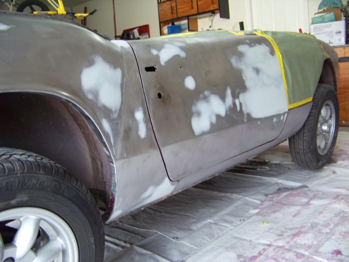 The body was exposed metal, and although blessed with dry weather, the days were dragging by, and rust was a real concern. We still had allot of work on the bonnet to do, but it was decided we would get the rest of the car under primer, before we had to deal with rust mixed in with our new body work. I learned the proper way to tape and paper, and did that correctly - on the second or third try. We were all set for primer.