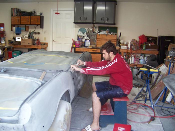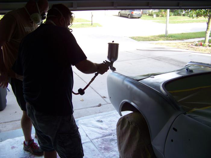 Coat 3 was much thinner, and it went on real fast. After smoking it this time, Cole had a brief moment of "how about a stealth fighter look" - it did look cool. The blocking was with wet 400 this time, and we switched to sanding pads. We were very happy with the results, the car looked great. After a month of sanding away our evenings and weekends, and our finger prints, we were ready for color. At this point, with the aid of the internet, I self diagnosed my right arm with a triple injury - tennis elbow, golfers elbow, and mouse elbow. It was done for a while. Jerry offered to clear out a space in his garage to shoot it, he reasoned he was more comfortable with his rig anyway. I took him up on it - mostly because it meant I could drive the car 2 more times. I think he was glad for the injury, he was going to have to tell me I sucked too much with the gun to clear coat it. We had a plan, and were off to the paint store....