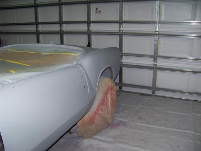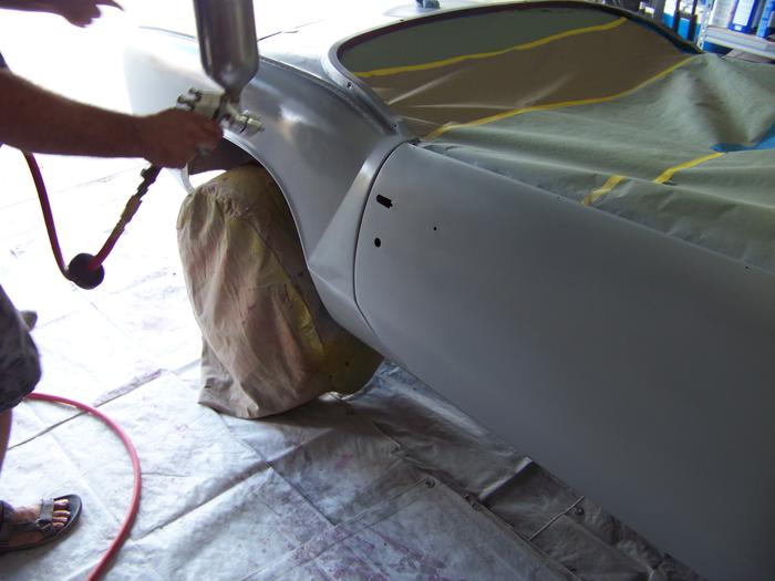 Jerry and I had made a dry-run rehearsal, so we both knew what was coming. He would shoot the first pass, I would shoot the second, and he was going to "clean up" on the 3rd. The only part we didn't practice was that he was going to do his "Drill Instructor SGT Simpson" impersonation over my shoulder during the second pass. It felt like I was home...on Parris Island again. His instruction was easy to follow: "FASTER!!!....SLOWER!!!....FEATHER!!!....MORE TRIGGER!!!....". I expected to get the command "MOUNTAIN CLIMBERS TILL YOU DIE - GO!", but it never came. Instead we had a debrief on what went well, and what I needed to work on - there were 6 more passes to go - and then color and clear coat. Jerry said he wasn't yelling, just talking loud enough to be heard over the compressor - but he never did explain the "bony maggot" reference...