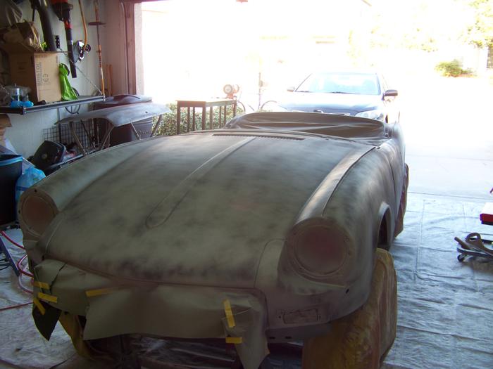 Coat 2 was similar to the first round. We reduced the primer a bit more - it came out faster, and Jerry had me move the gun faster - with his genital real time feedback - I don't remember exactly what he was yelling - I think it was something about his Grandmother paints faster - or I was painting like old people screw - but I got the idea, about the time I finished. We smoked it again, and blocked it again. This time with 180. Most of the shaping was done, just a few touch ups, and it was ready for the last coat.
