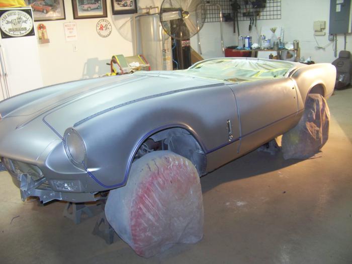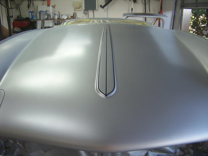 Color choices were made. Cole long ago had decided on a blue with silver scheme. With some guidance, he picked "Blue velvet pearl" - with lots of pearl, and a shot glass worth of it in the silver to help it blend. And a sleeve of 1/8" blue tape. Jerry had volunteered to lay out the stripes. The stripe package had been a 3 way discussion for a couple of months. I presented the general ideas, Cole culled out the ones he didn't like, and Jerry laid out his interpretation of what would look right. Being Cole's car, he had final veto power - and was not afraid to use it. He explained it best "this is a once in a lifetime gift (Jerry's assistance), and I want it to be exactly right". The idea that survived - A Le Mans inspired stripe at the bonnet, rolling along the sides, and having a modified version of the very rare dealer installed side strip up the rear quarter. Jerry liked it, but, insisted it needed pin striping outlining everything. And through the raised part of the bonnet. He laid it out on the primmer, and it was obvious, he was right.
