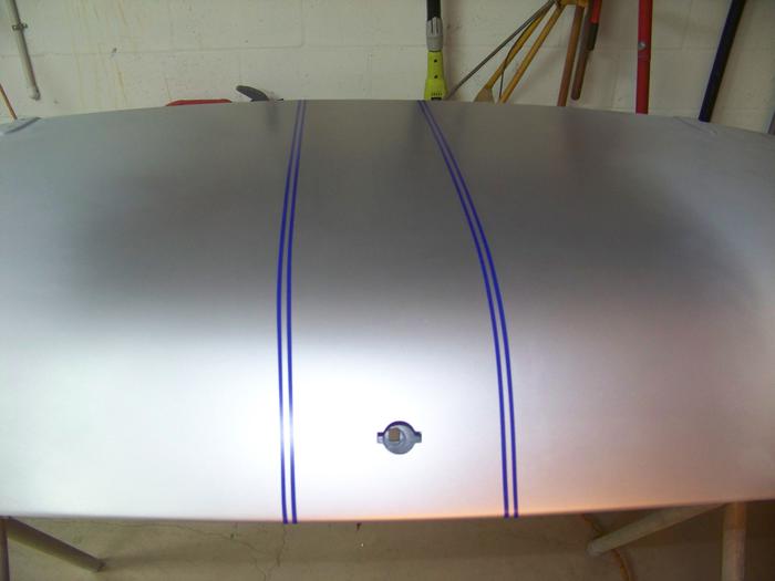 Jerry started on the raised portion of the bonnet. First a stripe of blue. When that was ready, he taped off the stripes - under very demanding supervision from Cole - and shot the silver. O-my! This was going to be fun!