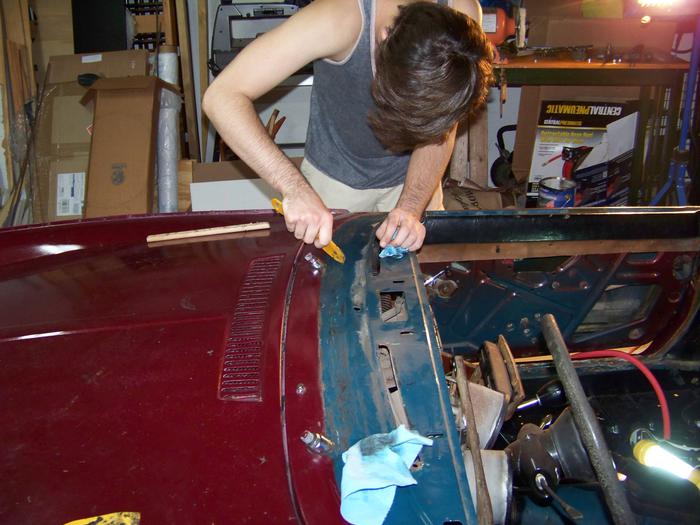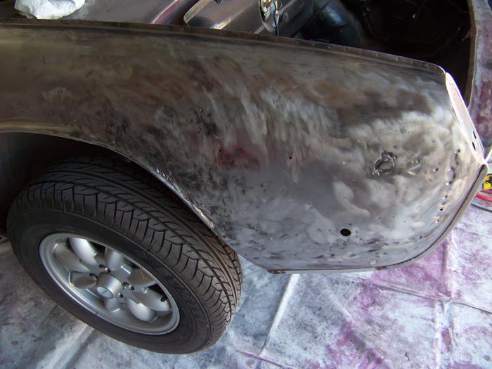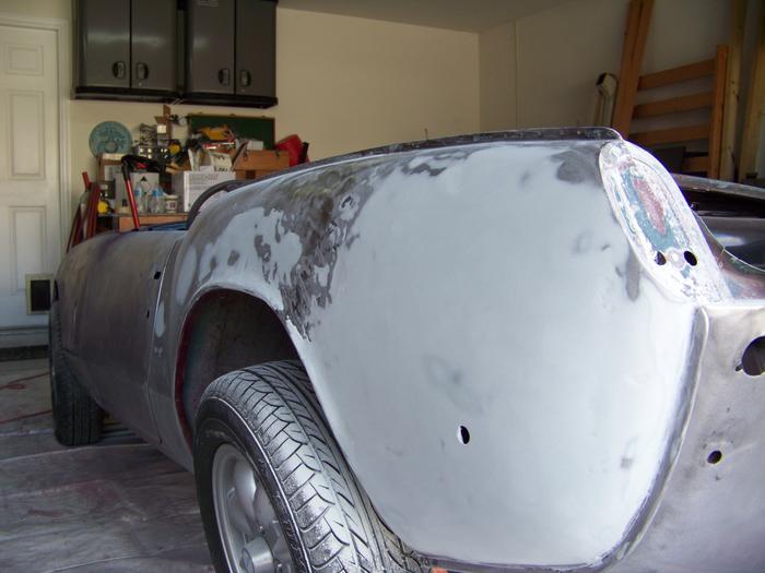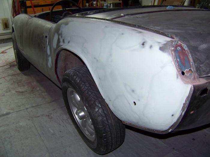 Well, I can't say I have never beaten on a car with a hammer anymore. Jerry brought over his body tools, and explained how it all works. Several times. With examples. Then more slowly with simpler words....Well, you get the idea. We started on the drivers side quarter panel. Turns out, its not a "rear wing", its a quarter panel. And the one in the front is NOT a quarter panel at all. We have had many a discussion about what a "hood" really is, and I have heard Jerry say "Bonnet" twice so far. So, I can give some too - its a quarter panel. But, unfortunately, it was a bashed in mess of a rear wing - er - quarter panel. Jerry also explained that an inch of body filler is not a good thing, and we need to shape it as close to the correct shape as possible. And, FYI, its not called "Bondo" if it cost $90 a gallon with a discount... So, this lesson was a big one. We shaped the metal. Filled the holes and sanded it flat until we feathered the edges. And repeated, going out farther, until the shape was correct. I was just learning how to "see" with my fingers...and they had a lot to see. I was struggling with getting the highs and lows just right, and allot of filler had to come back off. Jerry repeatedly demonstrated that 20 minutes of his time was much much more productive than several hours of mine. Good thing the body was so dinged up, I had plenty of opportunities to learn how its done. Ya, real good thing....