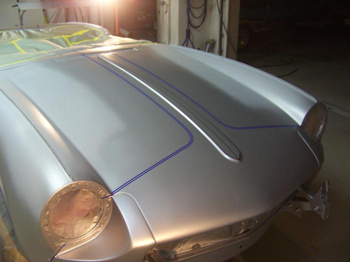 So much changes so quickly on the color step, I decided to break this up to allow more pictures. After the bonnet stripe was done and the bottom of the car was painted silver, the rest of the stripes were laid out. To get the stripes to line up across the bonnet seam, I installed the latches. Both Cole and Jerry paid attention to every single inch of tape. Jerry spent about 5 hours on the tape alone - but when he was done, it was perfect.