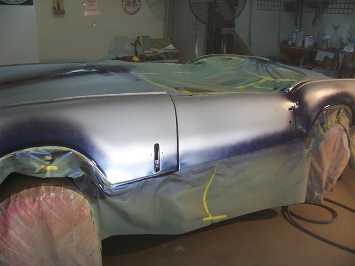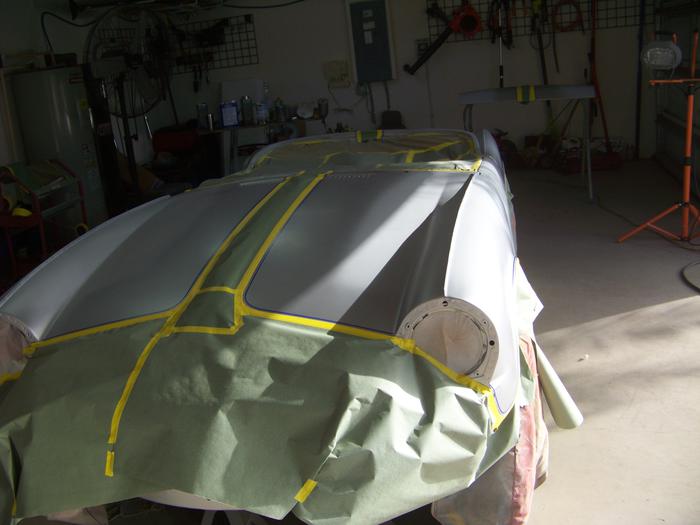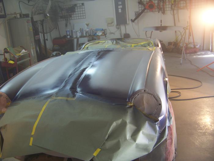 The work for the day began with taping off the silver, at the stripe line. Just by coincidence, the tape was blue, so before the blue paint. the blue stripes would be silver, and the silver stripes would be blue. The trunk lid had to be fitted and matched, then removed for paint. Then car was ready for the blue color!