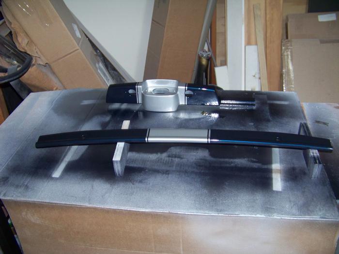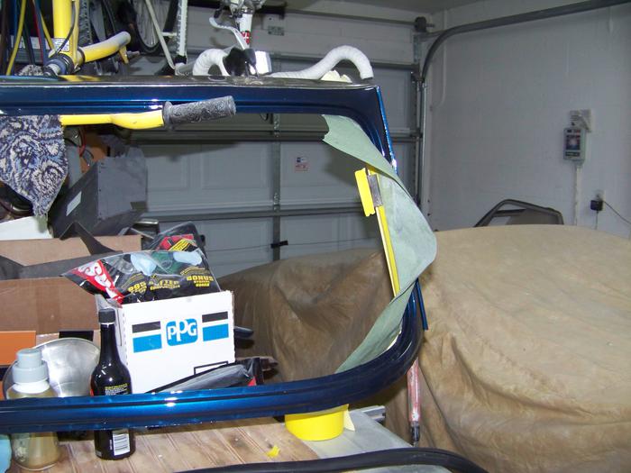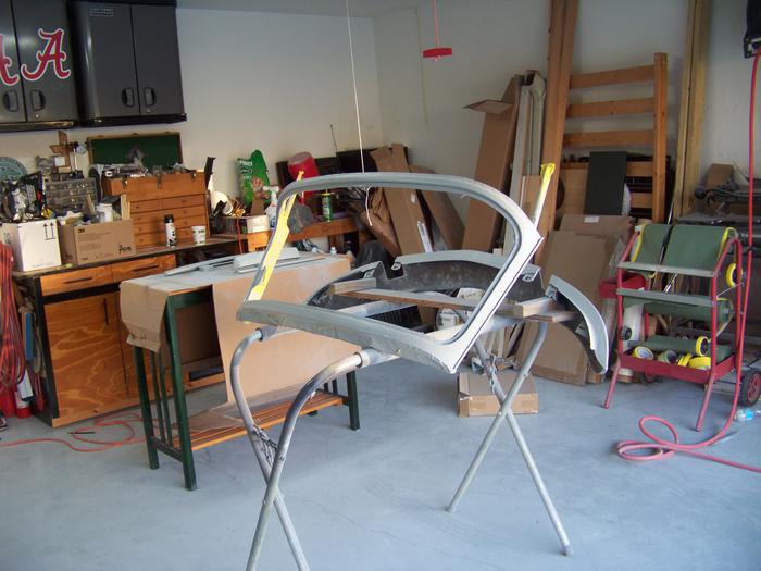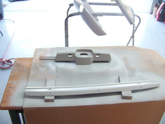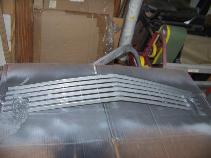 Jerry's help was invaluable all along, but, he kinda "took over" the color and clear. I didn't mind at all, the results are spectacular! But, this was also supposed to be my education. To make sure I was "getting it", Jerry left me a few projects that were not attached to the car. The biggest test was the valance - the body piece that goes under the grill. It was banged up, dented up, and bent. The windscreen frame was still in red paint, as was the rear light fixture. The rear snap molding was in black, and we decided it would be nice to paint it body colored. The front grill was black, and needed to match the silver stripe it would center in. So to prove my worth to Jerry - my mission was to complete all of the loose parts. Strip the paint, do the body work, prime and block to wet sanded, shoot the stripes and color, and clear coat. I moved a bit slower than Jerry, but within a week they were done.