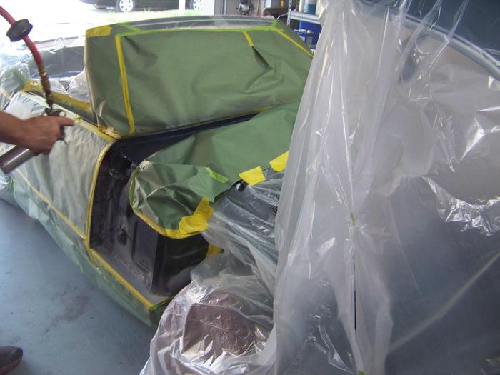 It probably would have made more since to do it the other way around - but when you do have a Jerry, you tend to use a Jerry! So, in all the great body work and final finish, we still had not addressed the door jams, or anything under the bonnet - paint wise. Fortunately, the striping gave us some good stopping points, and Jerry taught us a new trick with rolling tape, and gun/trigger technique, for blending. We have door finishers, and intend to use them, but, we painted the that area anyway. The finishers tend to go bad, and body color is a popular alternative. So, a few more hours under the mask, and a bit more clear to clean out of the garage, but the jams, and some of the under bonnet work is done. I still need to do the actual back of the bonnet - a project for another day.