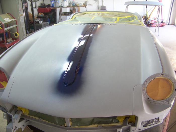 Jerry started on the raised portion of the bonnet. First a stripe of blue. When that was ready, he taped off the stripes - under very demanding supervision from Cole - and shot the silver. O-my! This was going to be fun!
