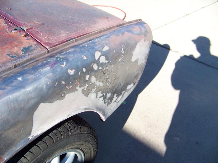 My mentor for this project, Jerry, is no fan of the heavy commercial "aviation" paint strippers available today, especially for use in the home garage. Most of his "recommendations" were actually "requirements", and the choose of stripper was not optional - "Capt Lees Spra Strip". Capt Lees is far more gentle on fingers, fumes and clean up - its water soluble! It can be deactivated on the car with alcohol as well. Very easy to work with, not as easy to find. Jerry started using it when he was stripping Corvettes - it wont eat the fiberglass - and that's where I had to go to get it - online Corvette suppliers. I ordered 2 gallons - and we have 2/3 of one left. Cole and I hit it hard during the Thanksgiving break, and put the paint job in a cardboard box with a couple of putty knives. We used a drill and wire wheels to get in all the nooks and crannies. The only thing left on the car was a light residue of melted pigment that had hardened, and the deeper body filler pockets. And there were a ton of those.
