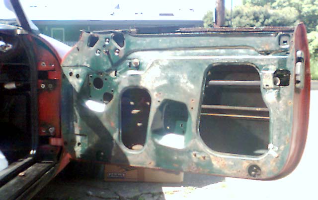 The early type door before disassembly. Remove top & bottom screws on right-hand runner, then two nuts holding on quarterlight from the bottom and two bolts from the side (under plastic plugs), then screws holding bottom of quarterlight runner at the bot