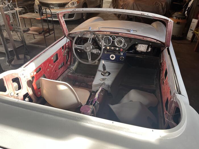 Well, finally got back to noodling around on the project car a bit. Almost looks like a car now. I have driven it up and down the street a few times, everything seems to be in good order, but have not yet really pushed it. Best to just take baby steps with as much as has been changed. Using a plastic break room chair as a drivers seat, don't want to put in the reupholstered seats until after painting is complete. Hydraulic emergency brake working as hoped. Bolted VW Kombi brake slave cylinders to the rear hubs to activate the disc brakes independently of the main braking circuit.
