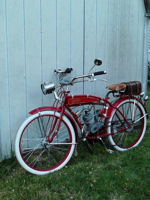 In the fashion of motorbikes from the early 'teens, I built Tempus to resemble an antique from the beginning. The frame is from a 1948 JC Higgins that failed to sell in a yard sale down the street and was placed at the curb, and rescued by yours truly. The engine is a little 49 cc bicycle motor. The tank, brass-&-walnut choke lever, leather mudguard, headlamp tank, and headlamp itself are custom fabrications, tail lights and trunk and other oddments are purchases.