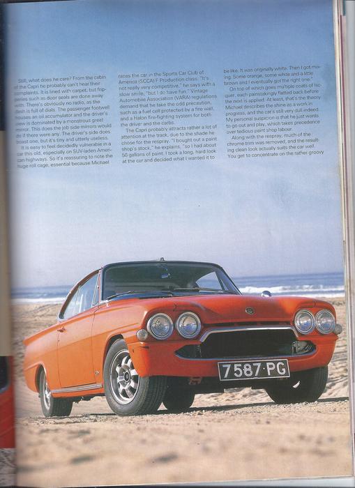 EnFord realized that they were missing a car in the Personel/Sports line so designed an entirely new car, engine, transmission for the 61-64 Capri. At first they put the 1340cc engine with a non syncro wide ratio tranny from their new saloon. This was the First "PRODUCTION" engine developed by Cosworth for the Lotus Super 7. Needless to say it wasn't enough for the 2000# Capri, so was soon updated to 1498cc and a full syncro box. This helped but there was pressure for MORE performance--the Brits race any and Everything-- so Cosworth was called in and added their majjic touch with weber carburation, headers, bigger valves more compression etc. Finally in 63, the Capri had a chance warring with the 1500 cc MG-A, Sunbeam Alpine etc. BUT--they'd moved on to 1600cc's a classic example of too little too late, typical of giant corps!