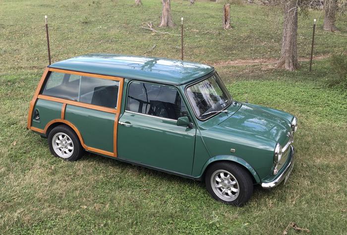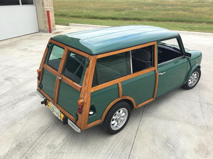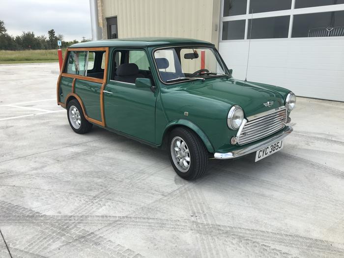 Supercharged "woody" estate. Started life as a 1970 Clubman Estate, rotisserie restoration and subsequent modification by M-Tech in the UK. Round nose grafted on, 1275 with rod change gearbox (3.2 final drive), 12" wheels, 8.4" disc brakes & Minifin drums, 1993 Mayfair interior. Swedish-built Opcon Autorotor supercharger.