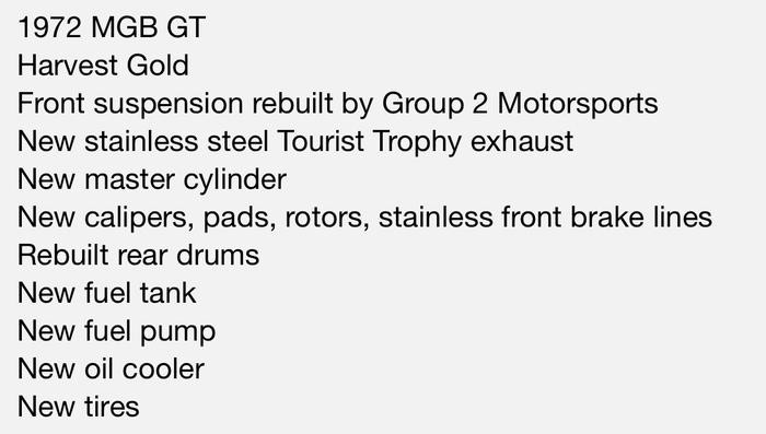 Factory: Abingdon, England Make: MG Engine: B-Series (1.2-2.4L) 4cyl Body Type: GT or Coupe Series: MGB MkIII (1970-1979) Market: USA, Left-Hand Drive Model Year: 1972 Car Number: 269392 Engine Code: Not Set These are "best guesses" based only on the VIN, completeness & accuracy are not guaranteed. Information entered by the owner should take precedence.
