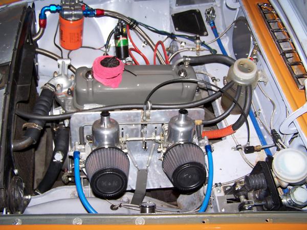 Fab-Tek Traction Bar Kit, Rear tube shock conversion, 800lbs. competition front springs, Front brake pads Hawk Blue 9012 Compound, Rear brake linings Carbotech, Fidanza Aluminum Flywheel, Twin SU HS-6 carbs, K&N RU-4410 Air Filters, ACME Speed Shop hybrid rear axle, New Fuel Safe Enduro 12 gallons capacity, Fram HPG-1 fuel filter, Holley Red fuel pump w/ Holley Pressure Regulator, Gauges: Fuel Pressure, EGT, Oil Pressure, Water temp, Oil temp, Speedometer